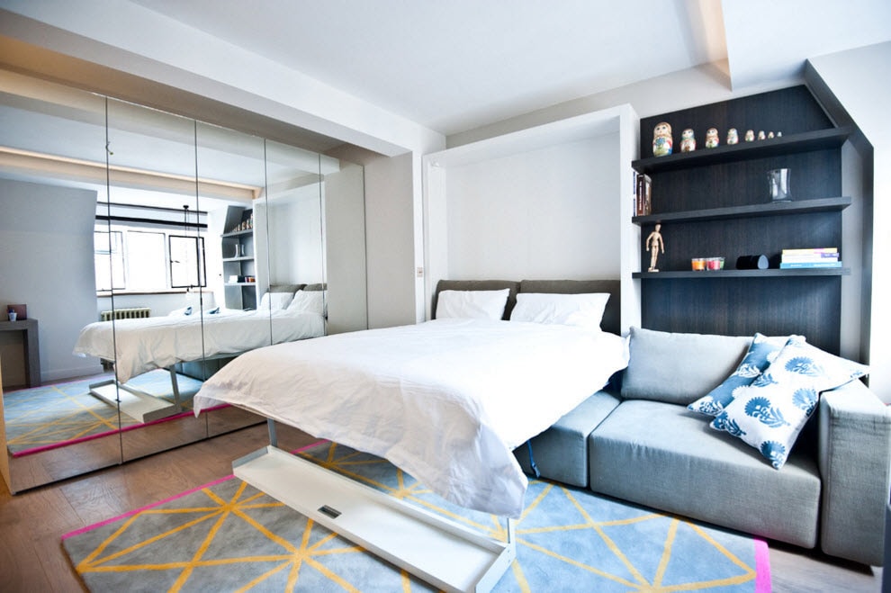Так, например, в небольшой двухкомнатной квартире родители, как правило, меньшую комнату оставляют детям, а сами располагаются в гостиной. Молодые семьи часто сталкиваются с такими ситуациями. И над грамотной организацией такого пространства с обычной мебелью можно долго размышлять. Вы только представьте, как в такой гостиной может поместиться кресло с небольшим диванчиком, шкаф, журнальный столик с телевизором и кровать. В такой обстановке при лучшем раскладе в комнате могут остаться узенькие проходы между предметами мебели, а сама атмосфера скорее буде напоминать какой-нибудь недорогой хостел с номерами, загроможденными лишней, но все же необходимой мебелью и двухэтажными кроватями напротив друг друга. Другое дело, если кровать будет занимать пространство лишь ночью, а днем оно будет абсолютно свободным.