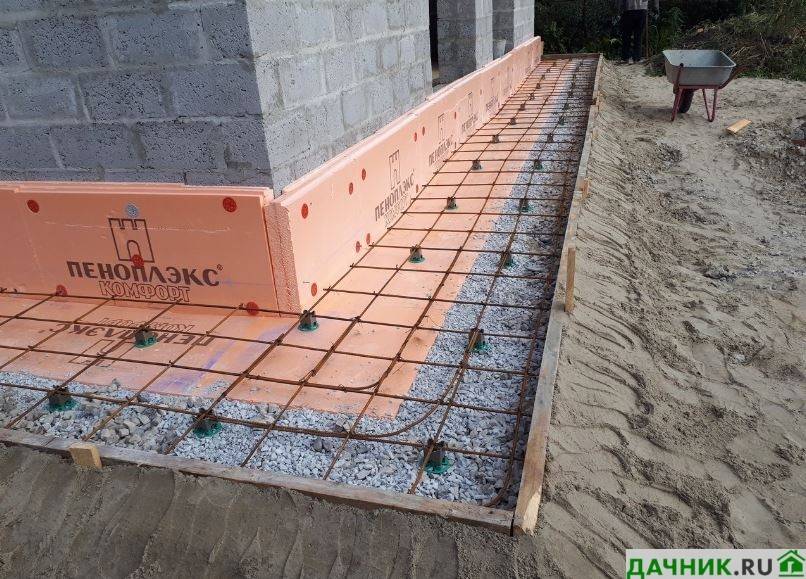 - Чтобы древесина не впитывала влагу из раствора, с внутренней стороны опалубку требуется промазать битумом. Её можно покрыть и прочной плёнкой, которую необходимо закрепить с помощью степлера. Концы плёнки нужно немного запускать на обратную часть доски. Затем сверху утеплителя укладывают арматурную сетку. Её желательно приподнять над утеплителем на 1–2 см с помощью специальных фиксаторов или небольших камней. Сетку нужно уложить внахлёст и связать, чтобы арматурный слой получился цельным;