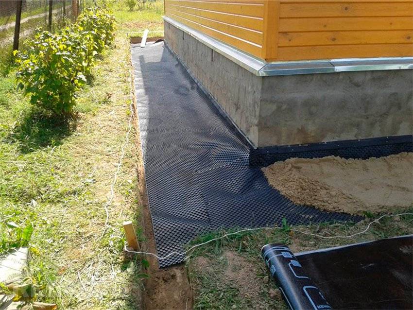 Потом полотно нужно перебросить на подсыпку, хорошо притоптать и подвернуть край на цоколь. В этом месте желательно выполнить плотное примыкание, промазав основание цоколя битумным герметиком и закрепив гидроизоляцию металлической планкой и дюбелями через 50–60 см. Крепление выполняется только в последнюю очередь, когда весь холст плотно придавлен к основе, а все складки и неровности разглажены.