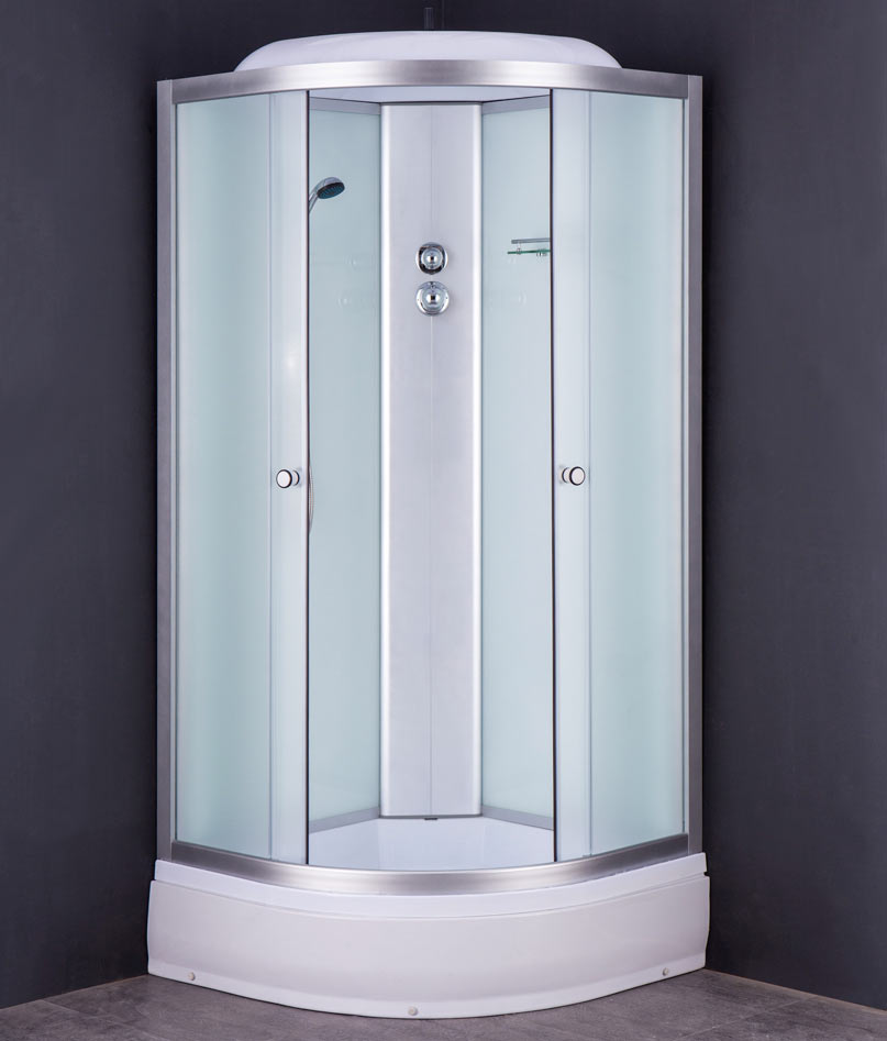 Это еще одна закрытая комбинированная душевая кабина с полностенным ограждением. Форма четверть круга делает ее удобной в установке даже в скромных по площади помещениях. Предусмотрен высокий поддон в 55 см на основе акрила. Есть противоскользящие покрытие, которое работает на вашу безопасность. Передние стенки выполнены из стекла толщиной 5 мм. На выбор можно заказать непрозрачное или полупрозрачное исполнение. Раздвижные двери демонстрируют плавный ход створок.
