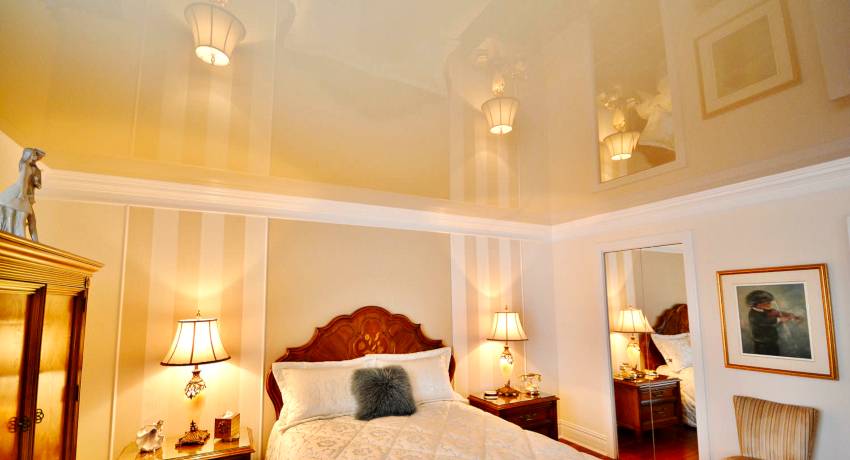Для спальни нужны потолки из полиэстера, т.е матовые. Причина в отражении глянцем света с улицы на кровать и, следовательно, на лицо, что мешает спать. Применение тяжелых штор проблему решает частично — убирает отраженный с улицы свет, но слепит глаза светом от бра, люстры, другого светильника.