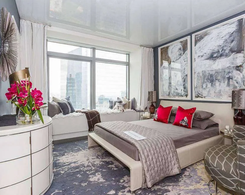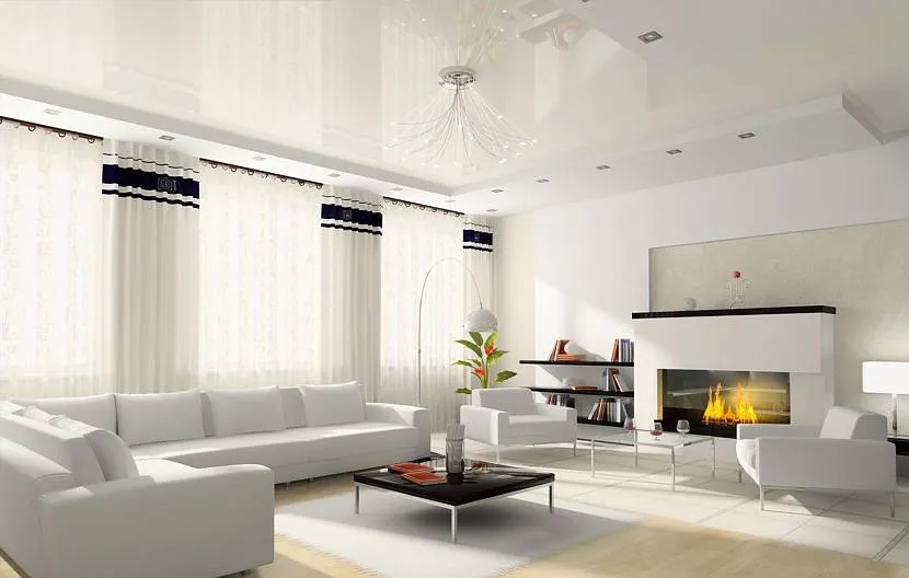 Натяжной глянцевый потолок обладает высокой способностью отражать световой поток. Поэтому дизайнеры предпочитают применять его в помещениях небольших размеров. Ведь в таком случае оно зрительно кажется большим, чем есть на самом деле. На фото ниже представлен интерьер с белыми потолками подобного типа;