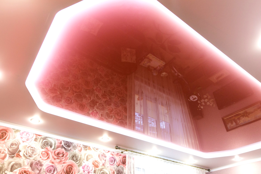 Кроме того, именно диодное освещение потребляет минимальное количество электроэнергии. Некоторые дизайнеры вместе с глянцевыми потолками предпочитают устанавливать диодные ленты, которыми можно оконтурить форму натяжного полотна и добавить поверхности объема за счет особого освещения.