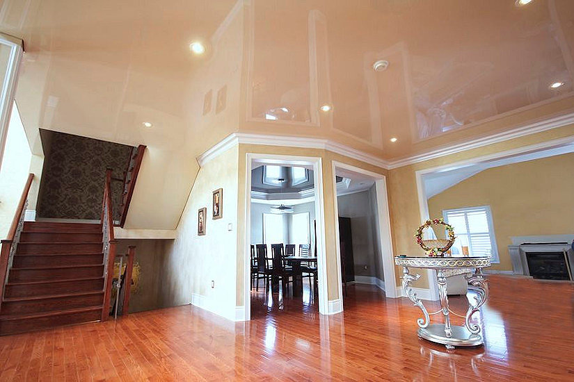 Пленка имеет гладкую блестящую поверхность, которая характеризуется сильной светоотражающей способностью. Благодаря такому эффекту пространство визуально расширяется, становится светлее. Поэтому натяжные ПВХ-пленки монтируют в небольших или слабо освещенных помещениях.