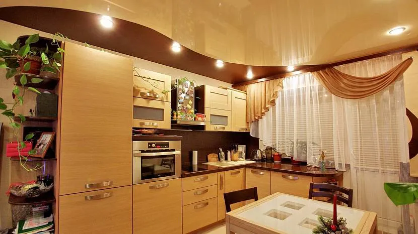 Глянцевый или матовый натяжной потолок на кухне? Здесь вопрос решается просто из-за незначительной, на первый взгляд, мелочи — пленка ПВХ хорошо противостоит воде и ее парам. Поэтому на кухне, с ее повышенной влажностью, — только глянцевый потолок. Выбор цвета, видов освещения и т.д. — задача дизайнера или вкуса хозяев квартиры. Есть здесь и еще один нюанс — такой потолок легче отмывается.