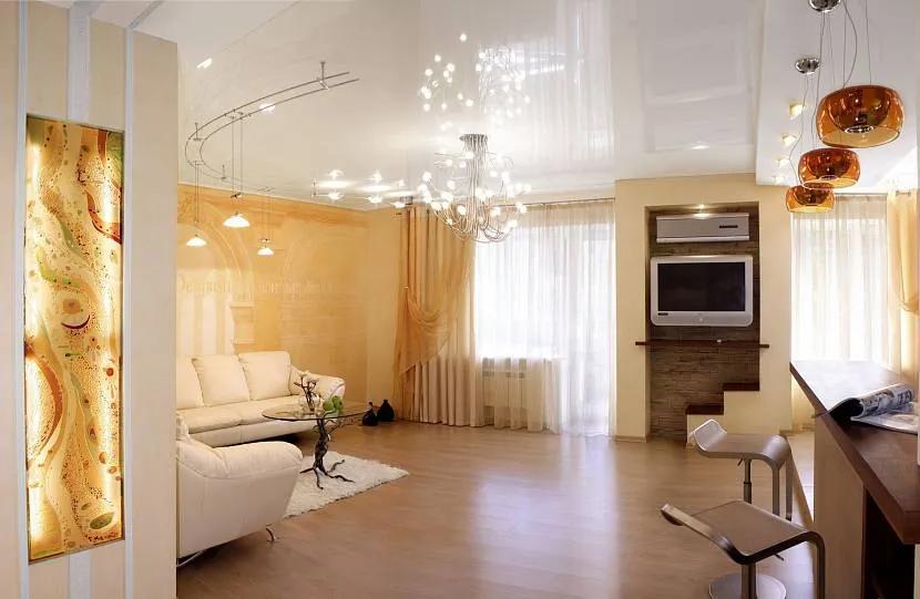 В комнате допустима небольшая глянцевая вставка в центре, там, где расположена люстра. Блики, блеск, игра хрусталя значительно усиливаются за счет отражения. При этом остальной потолок – традиционно матовый, поэтому не будет ощущения аквариума, не нарушится уют небольшой гостиной.