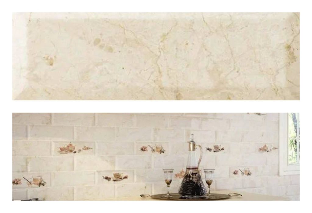 Плитки имеют глянцевую поверхность с характерным блеском. Графические элементы рисунка, их насыщенность и цвет незначительно варьируются в пределах одной партии. Чтобы достигнуть гармоничного внешнего вида предпочтительно использовать керамическую плитку из одной партии. Для дополнения основного материала можно использовать декоры, бордюры и мозаику.