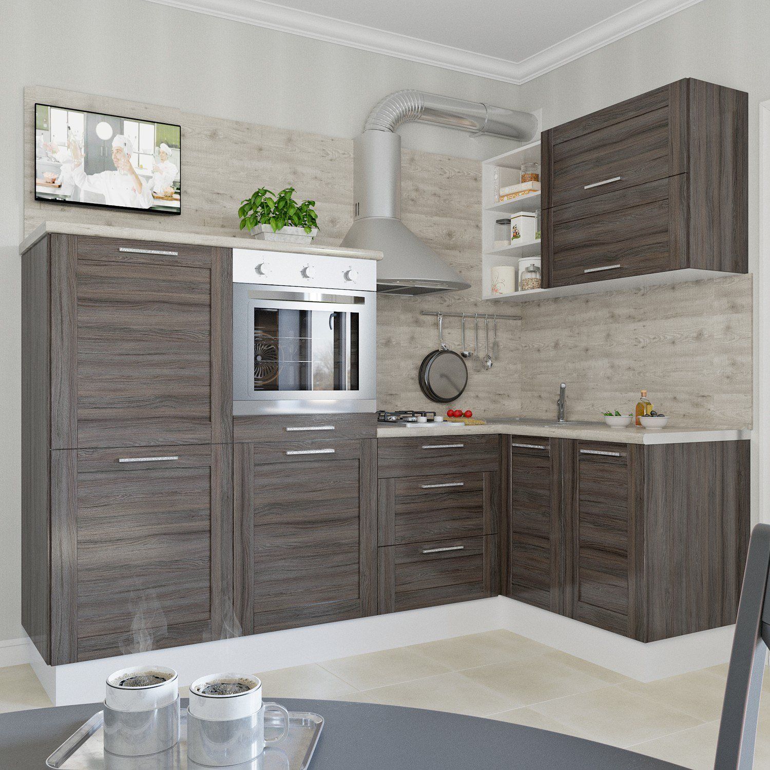 В предложении Леруа Мерлен целых 45 готовых наборов кухонной мебели. Среди них вы найдете солидную мебель из серии Lara, которая преобразит облик любого кухонного пространства. Нижние шкафы цвета венге умело сочетается с верхними шкафами, покрытыми дубом Сонома, благодаря чему кухня становится стильной и удобной для домочадцев.