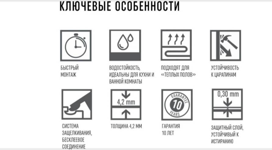- термостойкость покрытия позволяет ему выдерживать кратковременный контакт с непотухшей спичкой или упавшей сигаретой, которые не оставят на поверхности термического следа. Ламинат может быть уложен на систему «тёплый пол» без риска воспламенения или деформации. Высокие показатели влагоустойчивости позволяют использовать покрытие в помещениях с повышенной влажностью. Изделия хорошо переносят ежедневную влажную уборку, не разбухают и не расслаиваются;