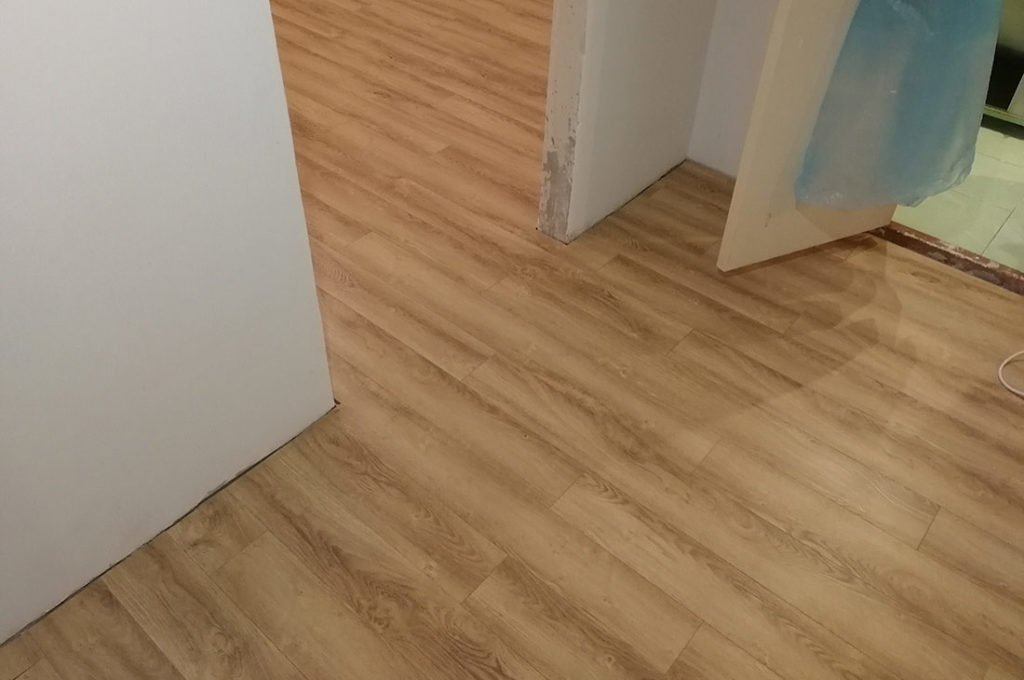 Осмотрев помещения, а укладка должна состояться, по желанию заказчика, безпороговым способом: порекомендовали подровнять стяжку в районе дверных проемов. Должен сказать – это самое «проблемное» место при заливке пола. В этом секторе чаще всего встречаются наплывы, мешающие плотному прилеганию покрытия к основе.
