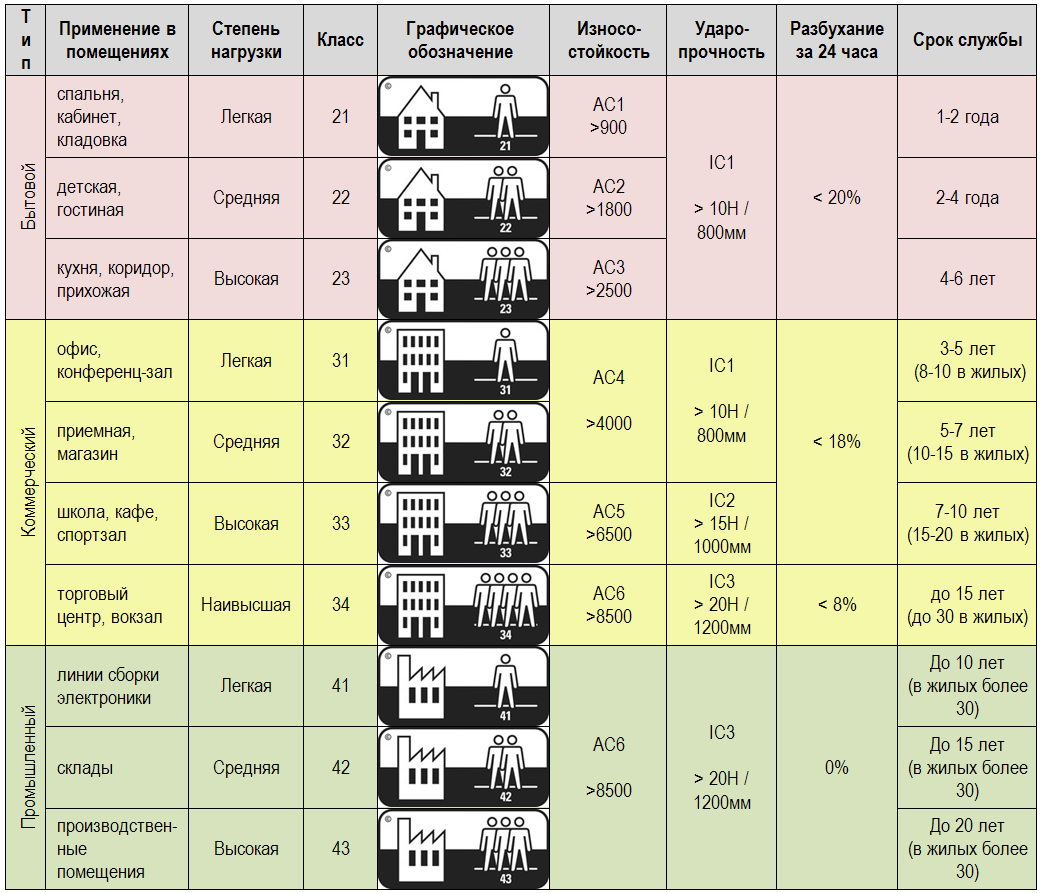 Конечно это далеко не весь список. На основе показаний европейская ассоциация производителей напольного покрытия разделила всю продукцию на две группы, а их в свою очередь на несколько классов. С увеличением класса возрастают эксплуатационные характеристики покрытия: