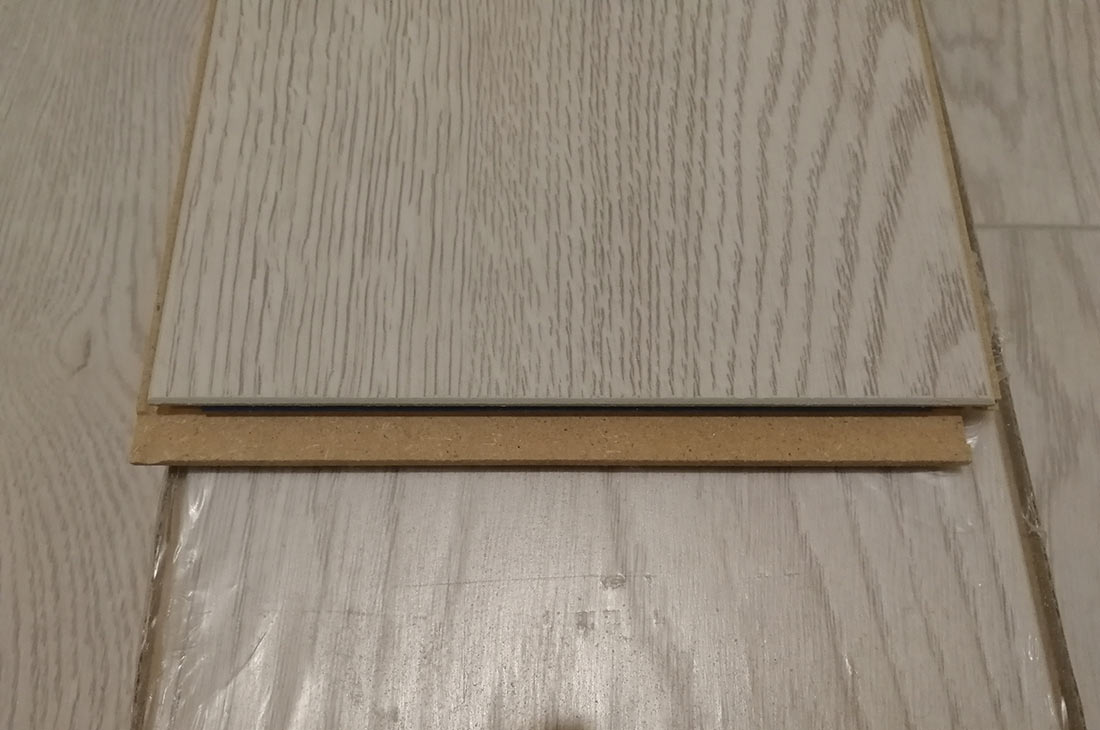 Толщина Classen Impression 4v составляет 10 мм, а плотность древесного композита внушительные 870 кг/м3. По опыту распиловки материала электролобзиком заявляю, материал пилится тяжело, пилки быстро выходят из строя. А плотность плиты напрямую влияет на прочность замков и влагостойкость самого материала. Соответственно, чем больше значение, тем лучше показатели.