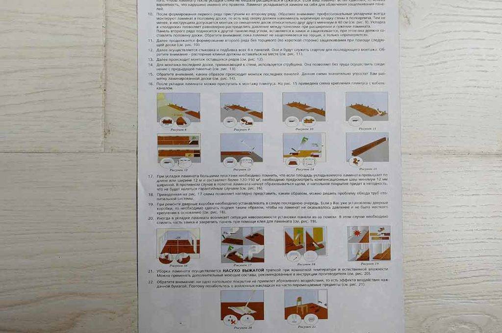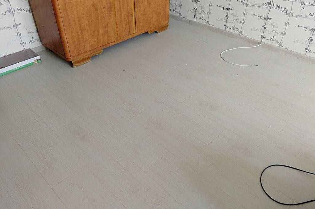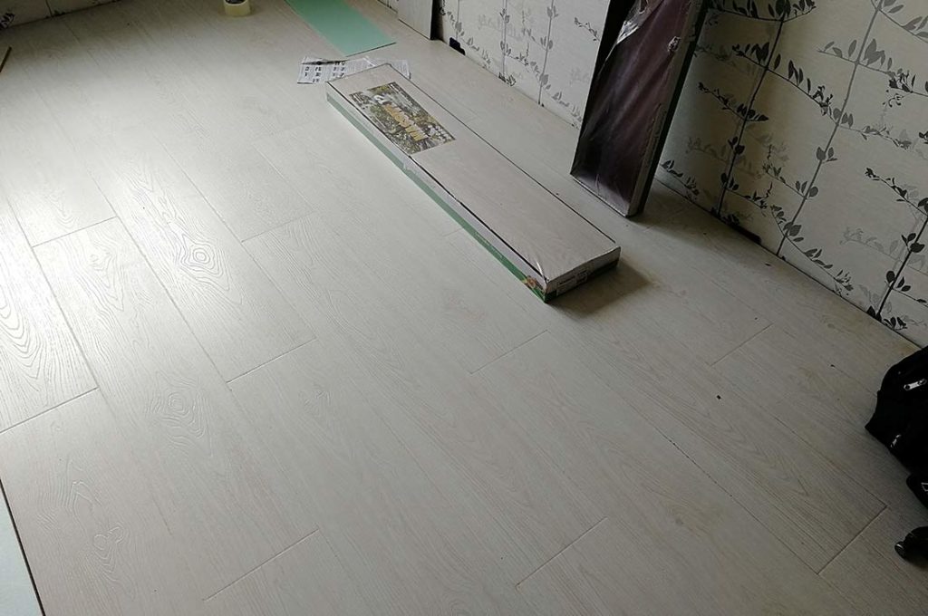 Из брака заметили одну доску с битым углом и одну с трещиной на декоративной пленке под защитным слоем. Помимо комнаты, должны были укладывать ламинат в коридоре, но по расчетам не хватало одной упаковки, поэтому перенесли дату окончательного завершения работ на следующую неделю.