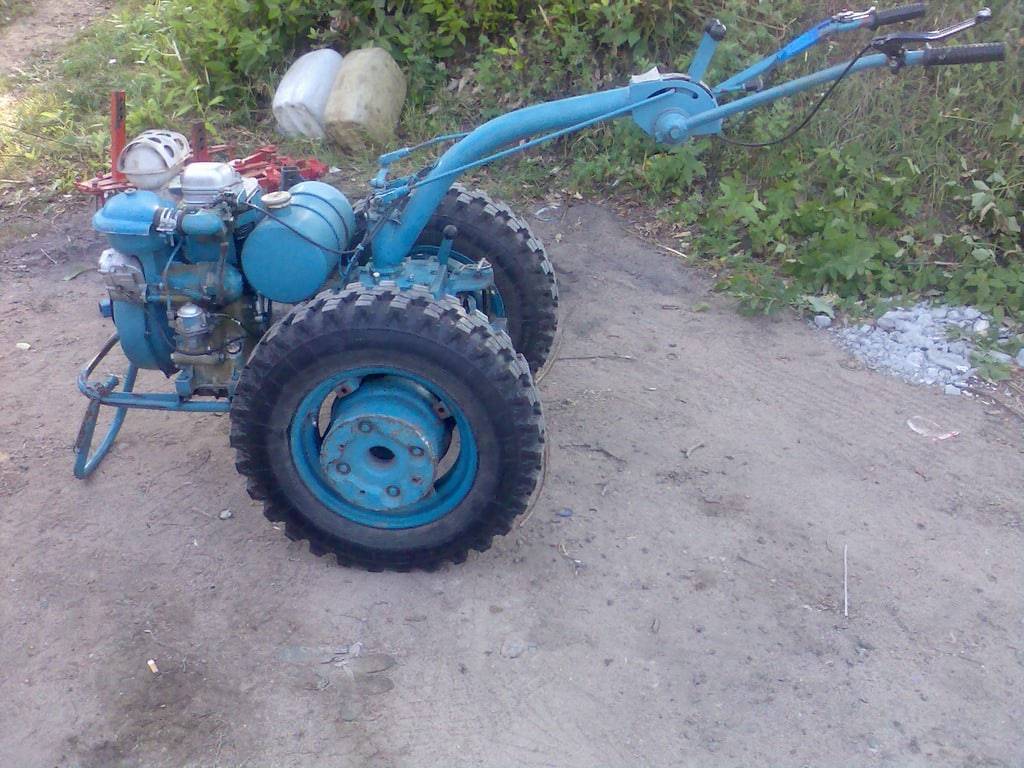 Колеса устанавливаются на фланцах конечных передач и снабжаются пневматическими шинами низкого давления (размер шин 5,90-13С, или 6L-12 по новой классификации). Колея мотоблока является переменной и изменяется вместе с перестановкой колёс. Пятилитровый топливный бак расположен впереди сверху, около крепления к корпусу рулевой колонки.