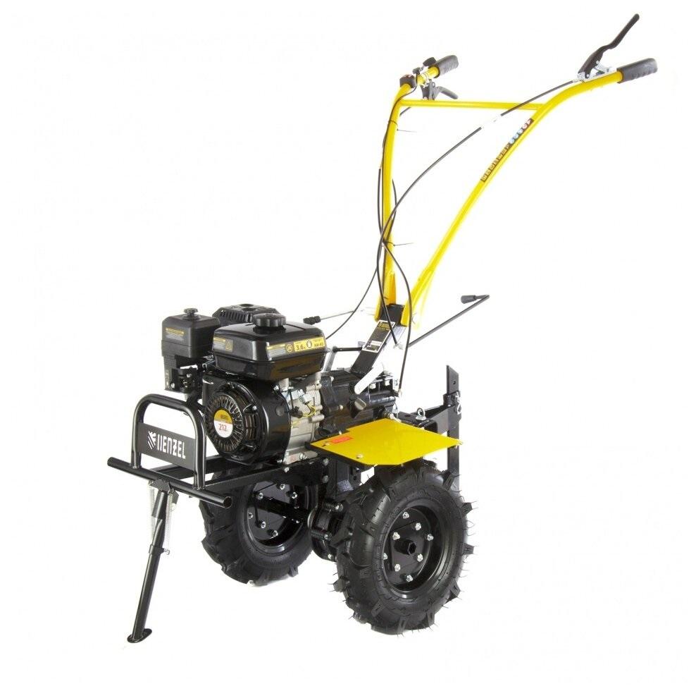Трёхручейковый шкив в совокупности с передним коннектором и задняя сцепка позволяют использовать всевозможное навесное оборудование; Большие колёса размером 4.00-10` на шестигранных полуосях обеспечивают уверенное движение по сложному рельефу. Высокий крутящий момент на колёсах, или на устанавливаемых фрезах, позволяет выполнять большинство операций по обработке почвы и транспортировке небольших грузов. Надёжный чугунный редуктор с цепной передачей стабильно передаёт крутящий момент с двигателя и создаёт условия для стабильной работы навесного оборудования. Регулируемые в двух плоскостях рукоятки улучшают маневренность данной техники. Защита по уровню масла предохраняет двигатель.