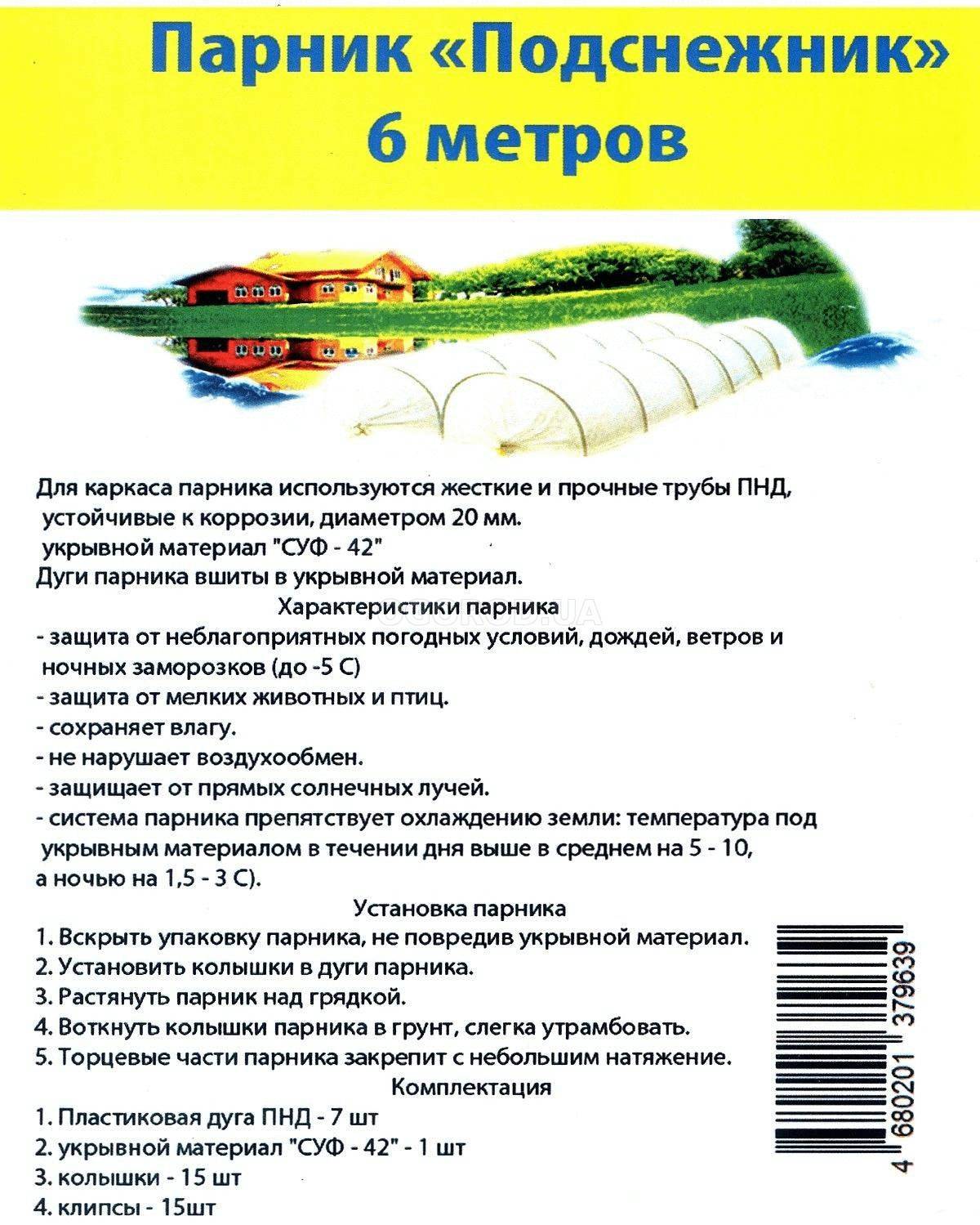Укрывной материал требует тщательного выбора. Часто используют плотную плёнку или агрополотно. Оба варианта практичны, обеспечивают внутри парника хорошие условия для растений. Плёнка оптимальна для простого парника, а модель «подснежник» предполагает вшивание дуг в полотно. Поэтому для конструкции используют агрополотно высокого качества. Такой спанбонд обладает следующими особенностями: