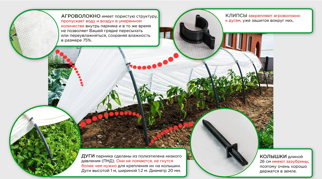 Кстати, каркасные дуги вшиты в материал не «намертво» – они проходят через специальные тканевые рукава, что позволяет легко передвигать спанбонд по ним и открывать парник для проветривания, так необходимого для нормальной жизни растений. А для фиксации ткани на определенном уровне в комплектацию «Подснежника» входят специальные клипсы диаметром 2 см.