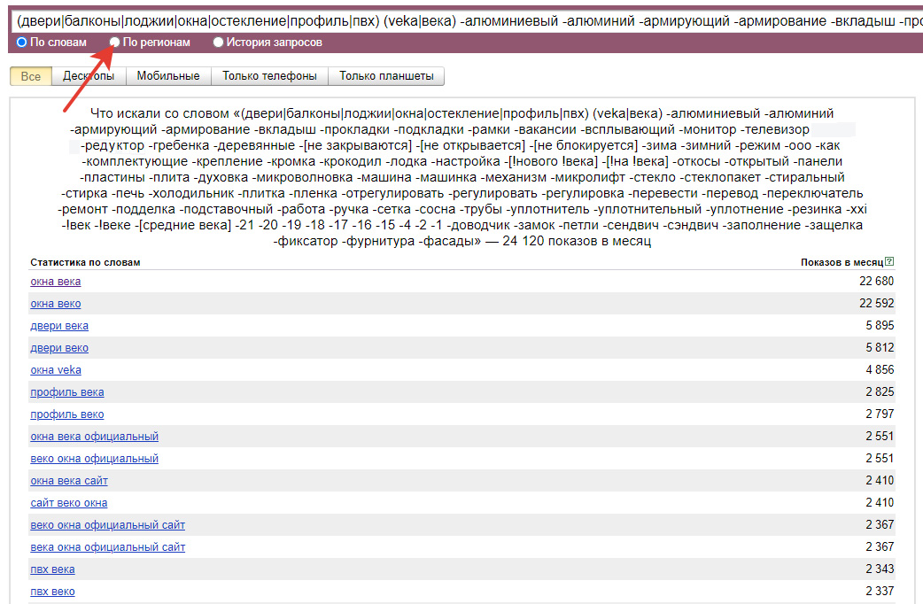 Однако, если просто ввести в строку подбора фразу, например, окна века, то Вордстат посчитает все запросы, включающие слова окна и век в любом контексте, порядке и падеже. То есть и окна 16 века, и век алюминиевых окон. Слово окна в сочетании с любым другим профильным брендом также дадут сильное искажение статистики за счет включения запросов типа подоконник Brusbox для окон пвх или, наоборот, исключения запросов типа профиль пвх Novotex. Чтобы точно получить частоту запросов, целью которых являются интерес именно к покупке окон, дверей или профиля пвх такого-то бренда, а не к замене уплотнителя, инструкциям по регулировке или вакансиям в компании, необходимо использовать особые операторы Яндекс-Вордстат (https://pixelplus.ru/samostoyatelno/stati/prodvizhenie-saytov/osnovy-raboty-s-wordstat.html). Они позволяют составить фильтр-маску из обязательных слов, вариантов написания бренда и слов, недопустимых в запросе – так называемых минус-слов.