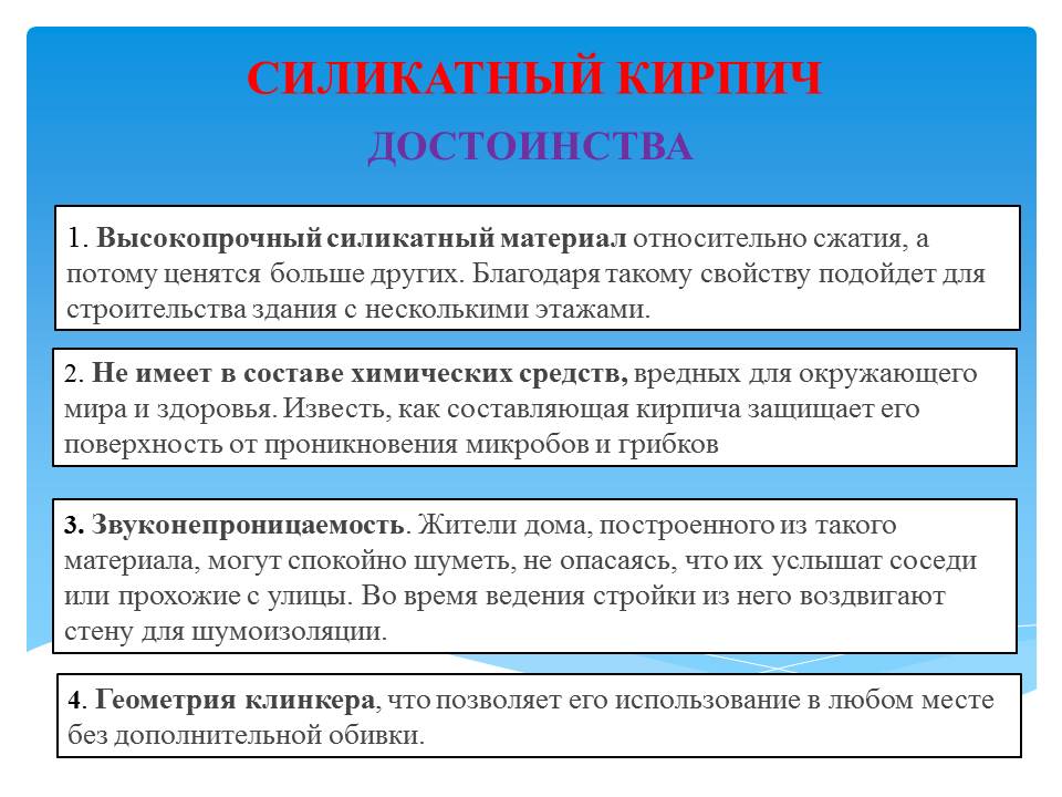 Основными преимуществами силикатного кирпича перед другими типами материалов являются следующие: