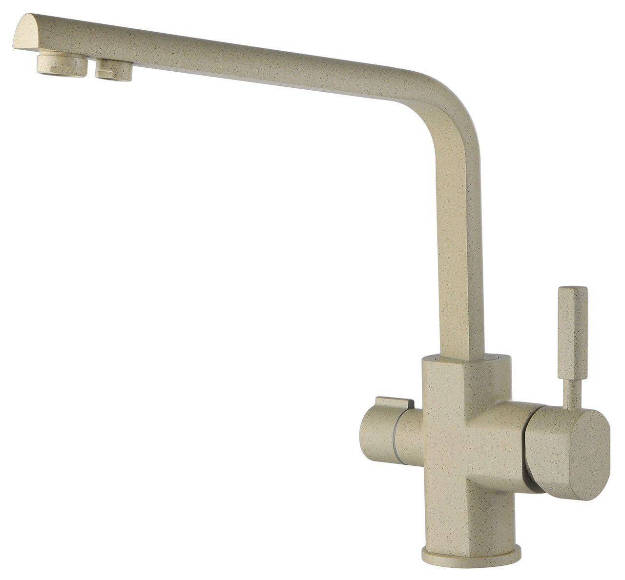 Смеситель Safira 15066 отличается по форме и дизайну, но комплектация и технические характеристики совпадают: фильтр для питьевой воды также присутствует. Покрытие латунного корпуса выполнено в 6 цветах: черный, белый, матовая сталь, хром, бронза, золото. Излив изогнут под тупым углом, прямой, с поворотным механизмом. Запорный клапан – керамический.