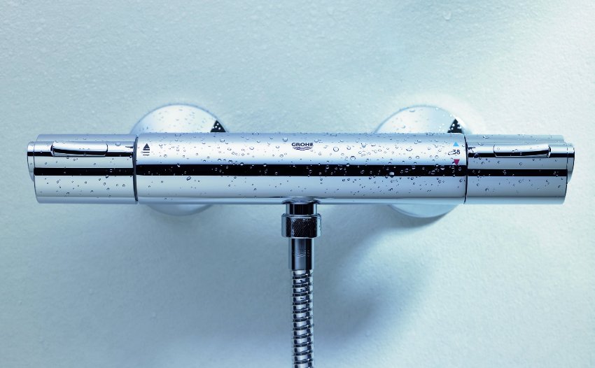Признанным лидером, поставляющим качественные и надёжные термостаты, стала немецкая компания Grohe. Элегантный современный дизайн смесителей сочетается с компактностью и долговечностью. На свою продукцию поставщик предоставляет гарантию в течение 5 лет. Краны надежно защищены от механических повреждений и с помощью новейших технологий позволяют экономить расход воды. Плавная регулировка и быстрое реагирование на изменение параметров среды не позволяет ощутить перепады температур. Цена прибора около 16 тыс. рублей.