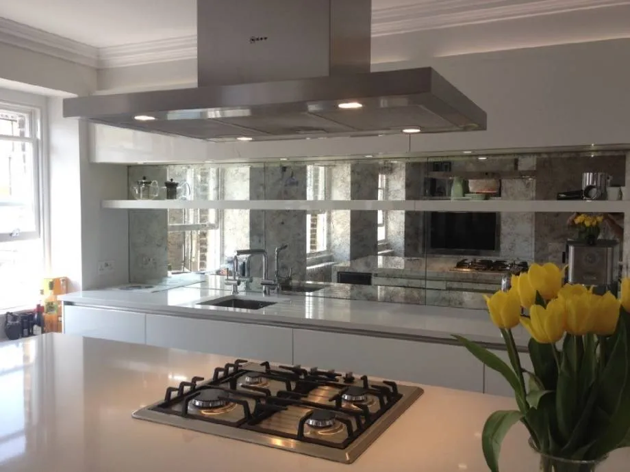 Кухонный фартук из зеркала белого цвета визуально увеличивает пространство. Если между рабочей поверхностью и верхним шкафчиком достаточно места, зеркальную поверхность можно сделать и по вертикали.