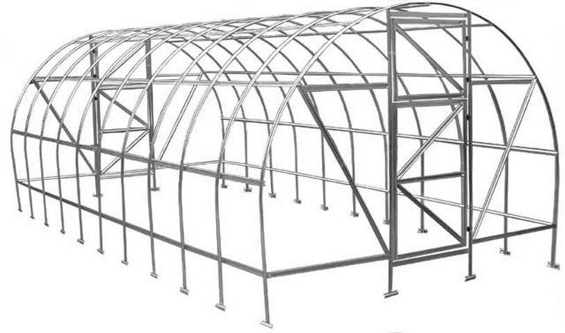 - Каркас. Для того чтобы теплица прослужила достаточно долгий период, следует выбирать изделия с усиленным каркасом, при изготовлении которого применялись продольные усилители. Конструкция должна состоять из стальных, оцинкованных цельногнутных дуг, расстояние между которыми не должно превышать 60-90 см. Желательно, чтобы каркас имел, как можно меньшее число стыковых частей и уже приваренные изготовителем фронтоны.