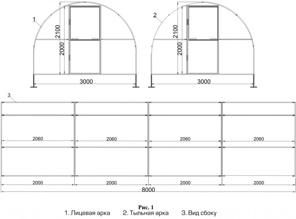 Торцы теплицы унифицированы и могут оснащаться дверьми и форточками. С этой целью на них нанесена разметка, согласно которой происходит монтаж.