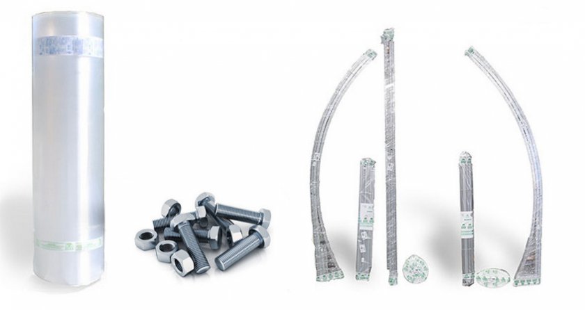 В базовом комплекте содержатся все детали, необходимые для сооружения базовой модели. Он включает дуги для 3 арок, соединяющие элементы, винты, саморезы, гайки и всё для крепления покрытия. Для базового комплекта достаточно 2 листа сотового поликарбоната, толщина которого 4 мм, и 3 поликарбонатных Н-образных профиля длиной 6 м.