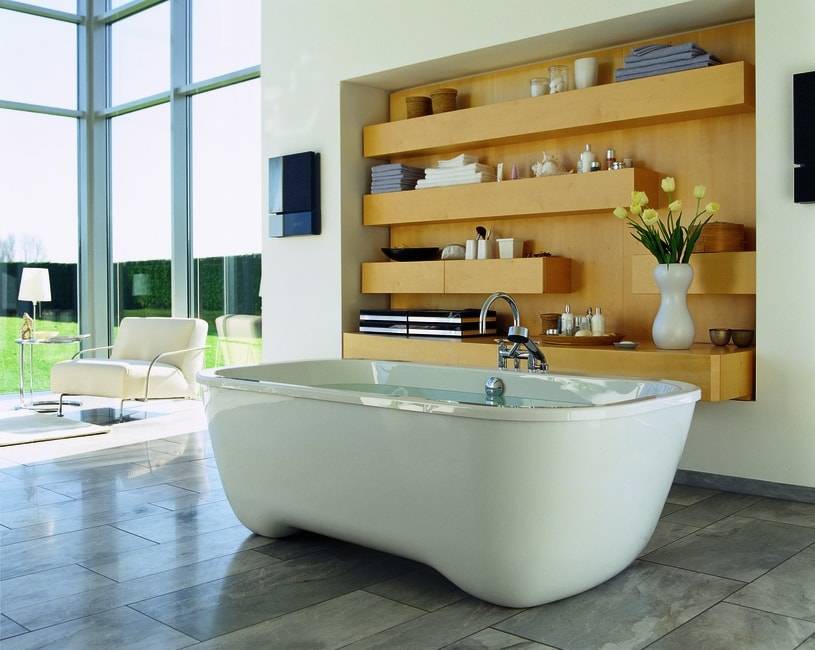 - Акрил – самый популярный материал, из которого изготавливаются ванны. Акриловые ванны доступны в различных формах, иногда они оснащены функцией гидромассажа. Преимуществами являются устойчивость к обесцвечиванию из-за ржавчины, длительное сохранение воды в тепле, а также легкая структура. Однако недостатком является подверженность царапинам.
