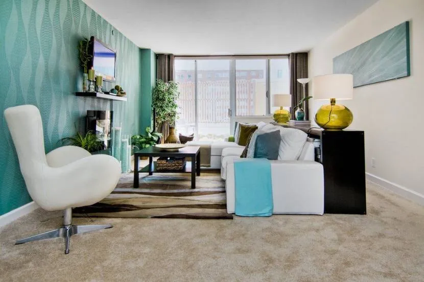 На фото бирюзовые антивандальные стеклообои. С помощью данного вида обоев можно скрыть неровные стены.