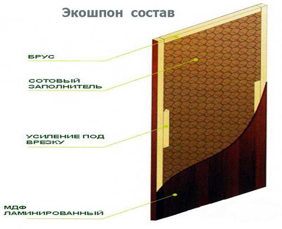 Покрытие дверного полотна, называемое экошпоном, сложно отличить от натурального дерева. Текстура и рисунок очень напоминают древесину, но способ изготовления такого покрытия значительно отличается от традиционного. Если шпон является тонким срезом дерева, то экошпон состоит из волокон древесины, скрепленных между собой клеящим веществом.