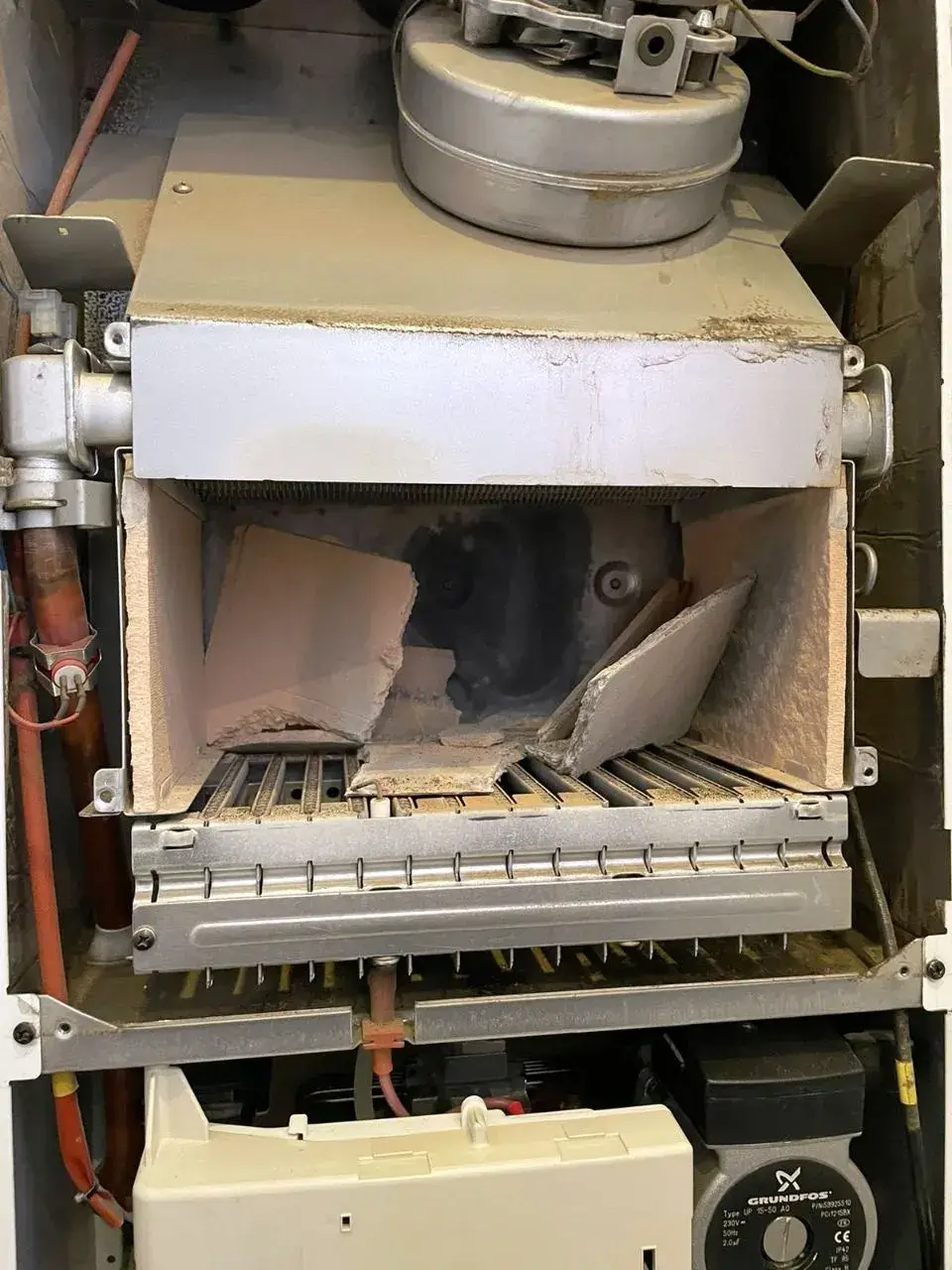 А вот такое может произойти, если не чистить теплообменник от сажи (перегрев топки, треснула задняя панель изоляции). Кстати ошибка была E01 – отсутствие розжига.