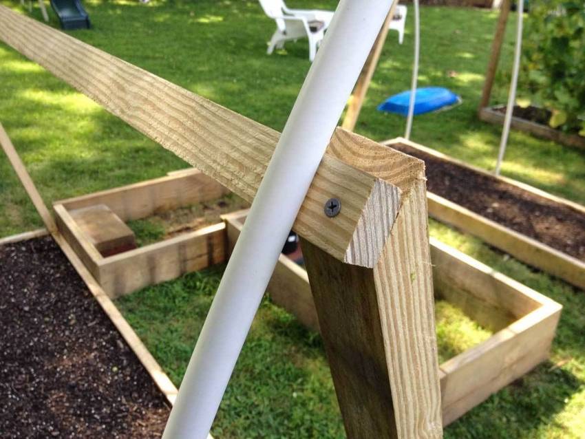 Рама верхняя, изготовленная из бруса 40х50 мм, монтируется на стойки. Промежуточные стойки закрепляются между верхней и нижней рамой, для улучшения крепления укрывного материала.
