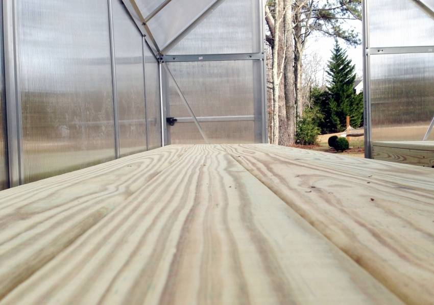 Для удобства, в теплице можно соорудить широкие полки из дерева, которые будут удобны для выращивания рассады