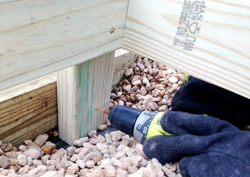 Сначала необходимо собрать нижний короб, который также будет служить дополнительным основанием. Изготавливают раму из бруса, который скрепляется с помощью уголков саморезами.