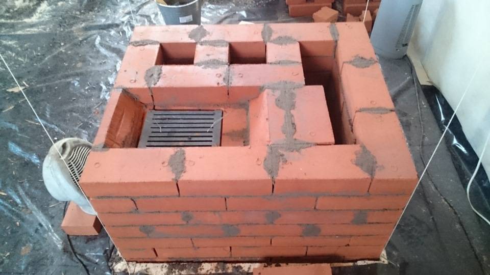 Изготовление самодельного агрегата из кирпича — это процесс достаточно трудоемкий. Для качественной кладки необходимо использовать специальные схемы и видео инструкции. Итоговое устройство занимает небольшое пространство, измеряя в кладке — примерно 2 х 2.5 кирпича. Следует использовать огнеупорный кирпич, а для изготовления раствора в качестве компонентов применять песок, огнеупорную глину и шамотный порошок.