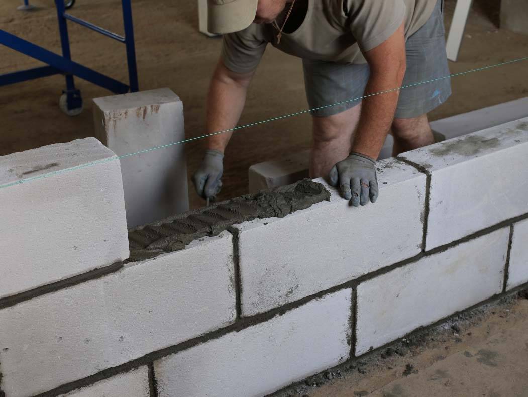 Работы по становлению первого ряда начинаются с угла, блоки ложатся на раствор из цемента и песка. Строители предлагают использовать простые приспособления для облегчения кладки газосиликатных блоков своими руками — это шнур и колышки.