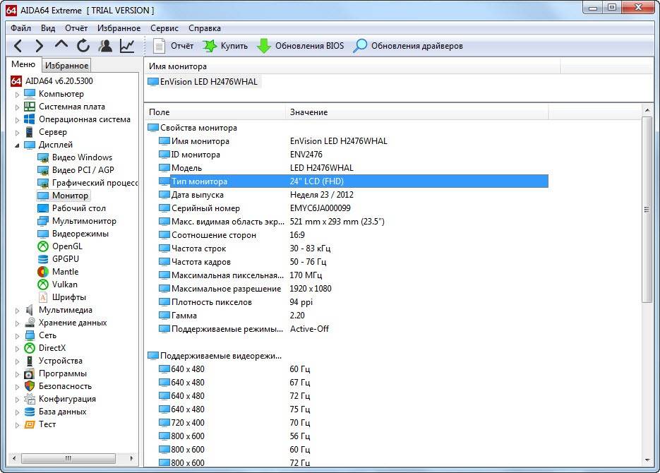 Пользуется популярностью утилита AIDA64. Она покажет сведения по всем параметрам аппаратуры. Свободно распространяется, но есть ограничение в бесплатном использовании (30 суток). Диагональ обозначается моментально и записывается в рубрике «Дисплей», раздел «Монитор», пункт «Тип монитора».