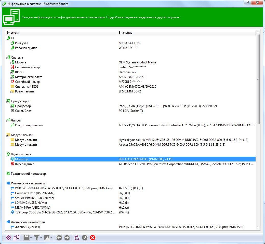 Еще одна программа PC Wizard представлена в обычной версии и Portable (не требует установки). Эти варианты предлагаются бесплатно. Модификация без установки отличается удобством, быстро запускается. Сразу идет сканирование данных, результат формируется в окне «Общие сведения о системе». Он содержит строчку «Тип монитора», размер указан в дюймах.
