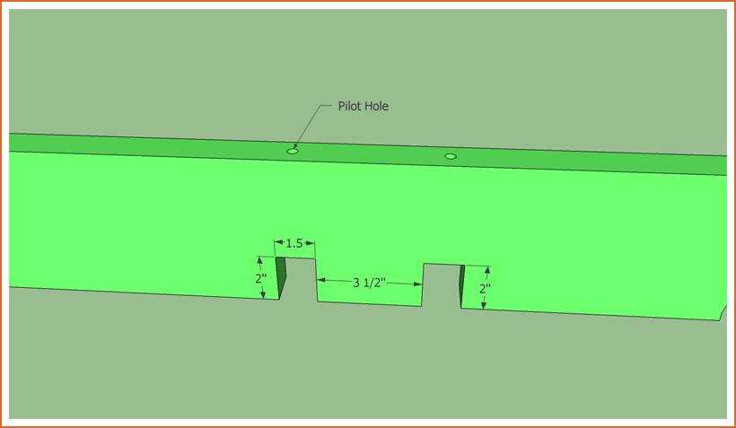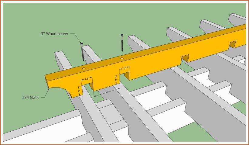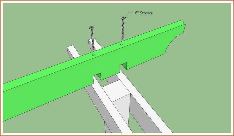 Поперечные балки крепятся к опорной посредством пазов, которые необходимо выпилить согласно размерам чертежа. После установки в паз балки дополнительно закрепляются саморезами.