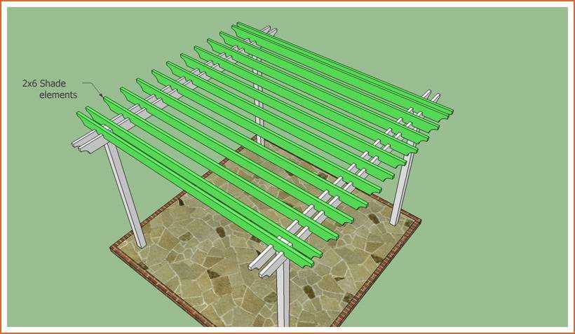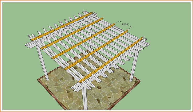 Для их изготовления подойдёт доска 5×15 см. Количество поперечных балок определяется исходя из того, чтобы при установке расстояние между ними были около 30 см. Возможно установить их чаще, тогда будет меньшая светопроницаемость и больше тени.