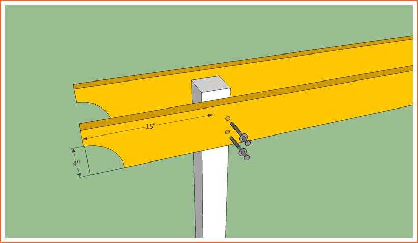 К точно выступающим стойкам прибиваются две основные балки. Для снижения затрат на строительство вместо них используем две доски, которые крепятся чуть ниже верха — на 5-6 см ниже. Стропила необходимо закрепить строго горизонтально. Как уже было сказано, можно использовать гвозди, шурупы или болты. Если соединяете саморезами, берите белый, а не черный — они намного прочнее и выдерживают большие нагрузки.