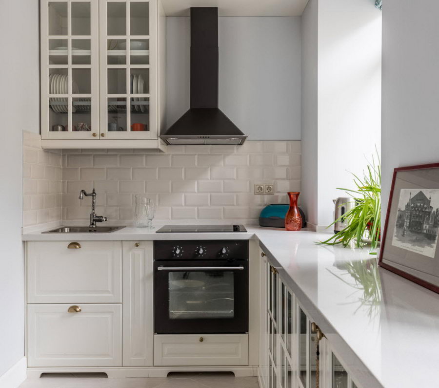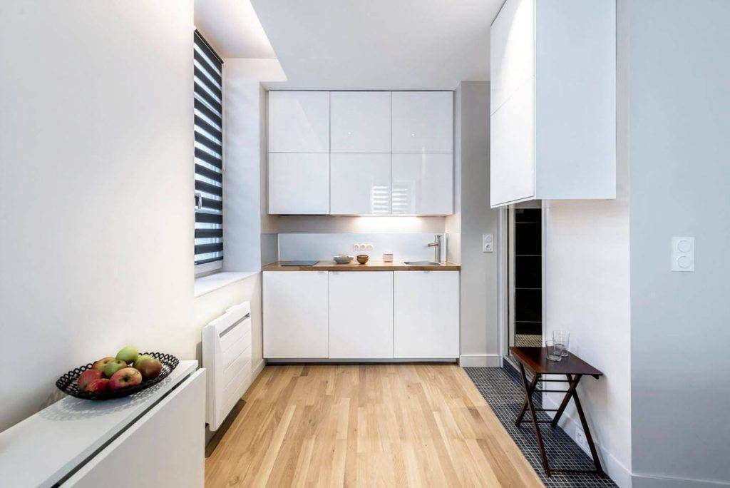 Не занимают места еще и двери-гармошки. Они удобны и долговечны, легко эксплуатируются и устанавливаются. Некоторые модели можно заказать индивидуально под арку. Для обустройства малогабаритной кухни используют Г-образную, линейную и реже угловую мебель. Последняя подходит даже для квадратных по форме помещений.