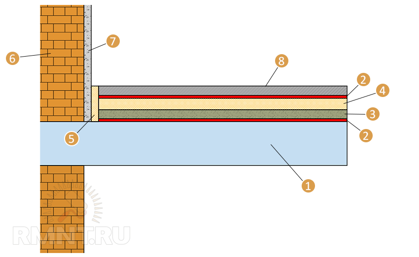 1 — плита перекрытия; 2 — слой гидроизоляции; 3 — слой звукоизоляции; 4 — слой теплоизоляции; 5 — кромочная (демпферная) лента; 6 — стена; 7 — штукатурка; 8 — кальциево-сульфатная/цементно-песчаная стяжка