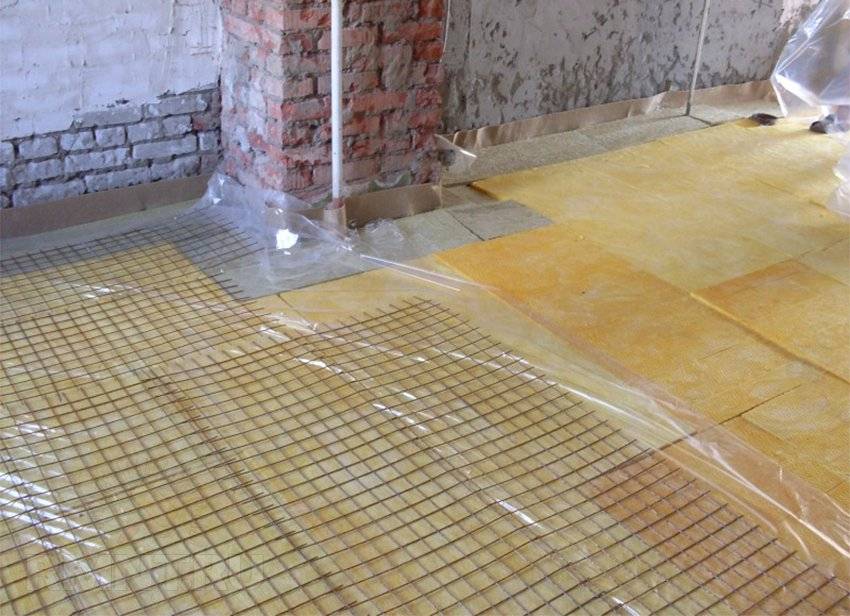 Рассмотрим распространенный вариант. Для сохранения свойств утеплителя между стяжкой и нижним слоем укладывают полипропиленовую пленку толщиной 1,2 мм. Эту же пленку укладывают и на основание для исключения попадания влаги между стыками материала.