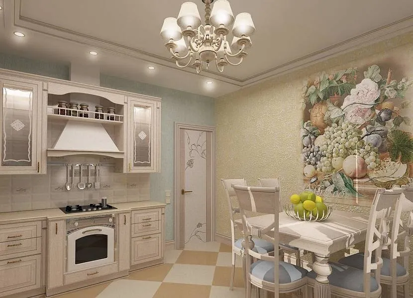 Квадратная керамика шириной 6 и 12 см подходит для дизайна интерьеров в стиле прованс или скандинавском. Светлая или пастельная гамма этой плитки подойдет для небольших помещений. В сочетании с мелкими фрагментами напольного покрытия такой кафель зрительно расширит кухню и сделает ее светлей.