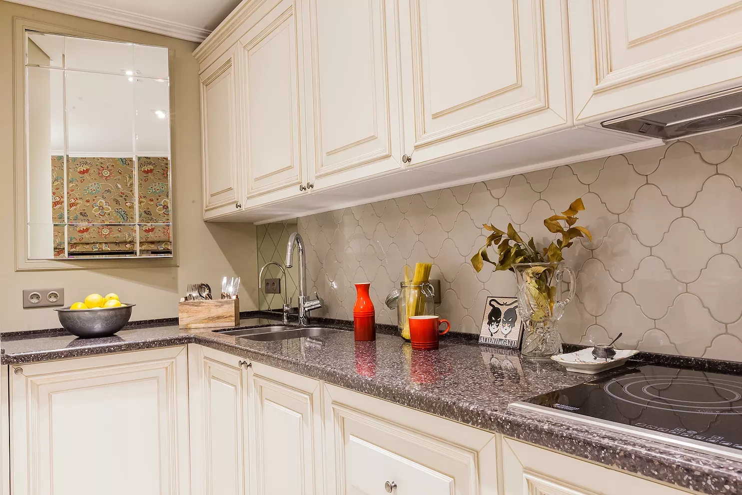 Кухонная плитка с большим количеством элементов понравится любителям ретро. Материал использовался хороший, поэтому небольшие повреждения и воздействие бытовой химии он выдержит без особых проблем. Подойдет для облицовки кухонного фартука и ванной комнаты, что также добавляет ему преимущества. Гармонично смотрится вместе с некоторыми современными решениями.