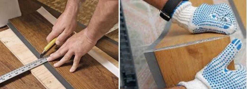 Укладку виниловой плитки с фаской надо начинать также как и паркет или ламинат, отступив 1 или 1,5 см от стен. С изделий, которые будут класться в первом ряду, ножом срезается верхний край. Затем по торцу они прикладываются и склеиваются фасками.