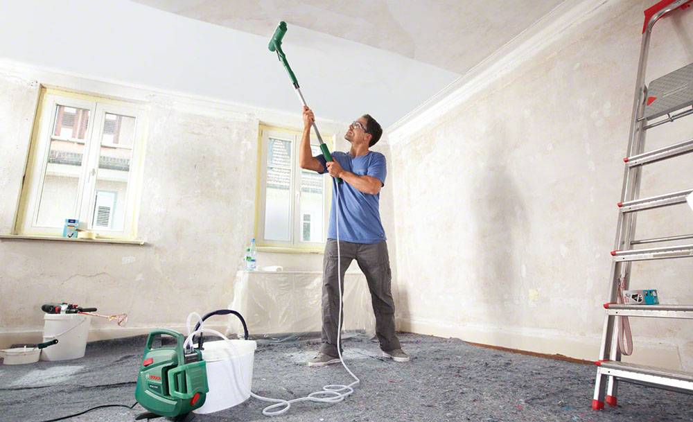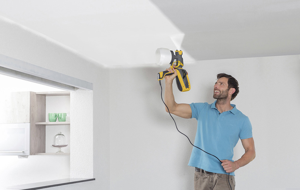 Также активно интересуются люди, чем лучше своими руками белить в помещениях потолок. Для этого обычно пользуются валиком, кистью или распылителем, то есть краскопультом.